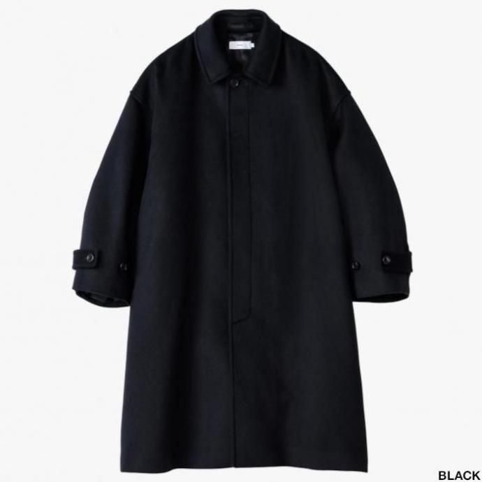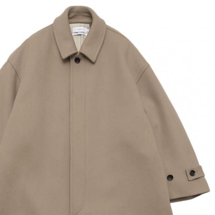 SUPER140’s原料を混紡したダブルメルトンを使用したゆったりとしたオーバーサイズシルエットのステンカラーコート。原料からくる風合いの良さに加えて中糸に水に溶ける糸を混ぜ込むことでふくらみ感がありながら軽く、暖かい空気をため込んでくれる。ショートビーバー仕上げにすることでフラットな見え感でありながらも押し固めないので柔らかくふくらみのある風合いを保っている。