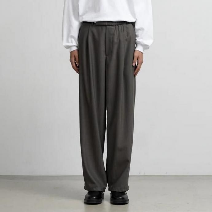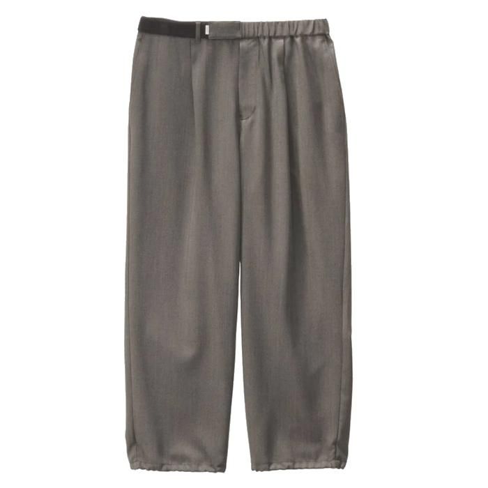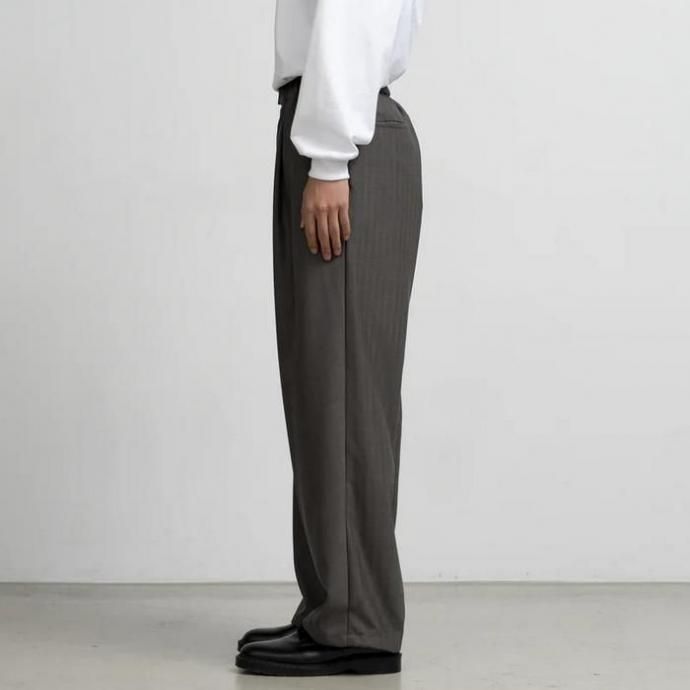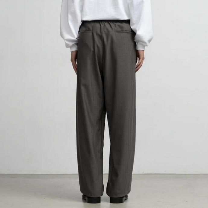80`sのムードを纏う組織感の際立つメランジウールのヘリンボン生地。アーカイブに見られるジャガードの立体感を再現するため、膨らみのあるウール糸とポリエステルを撚り合わせ、指先で感じるシャープな綾畝が印象的。裾に配備したスピンドルでシルエットの変化を楽しめるシェフトラックパンツ。