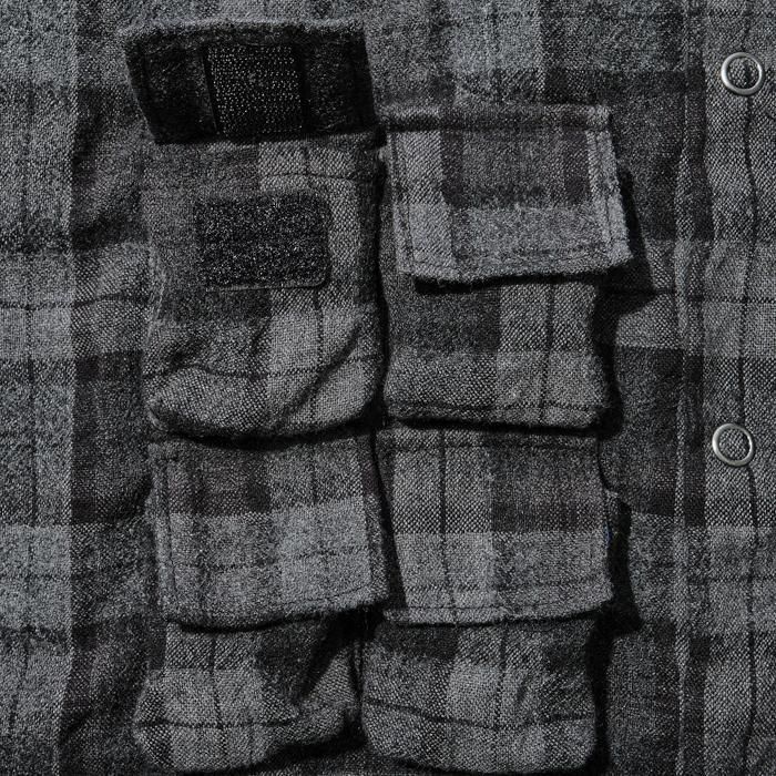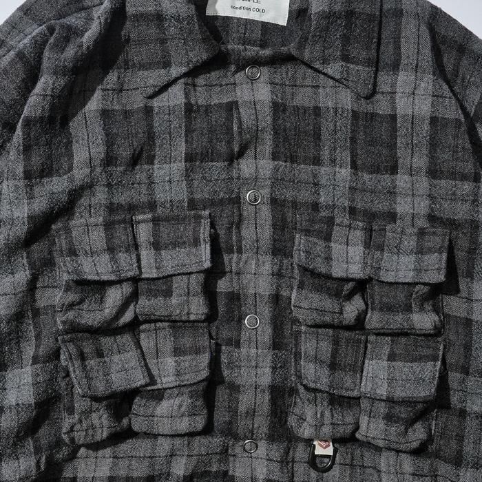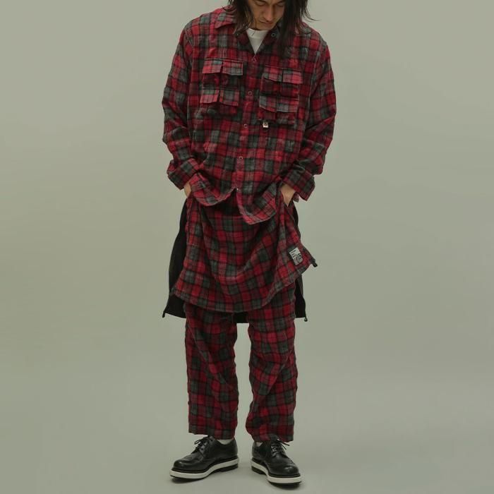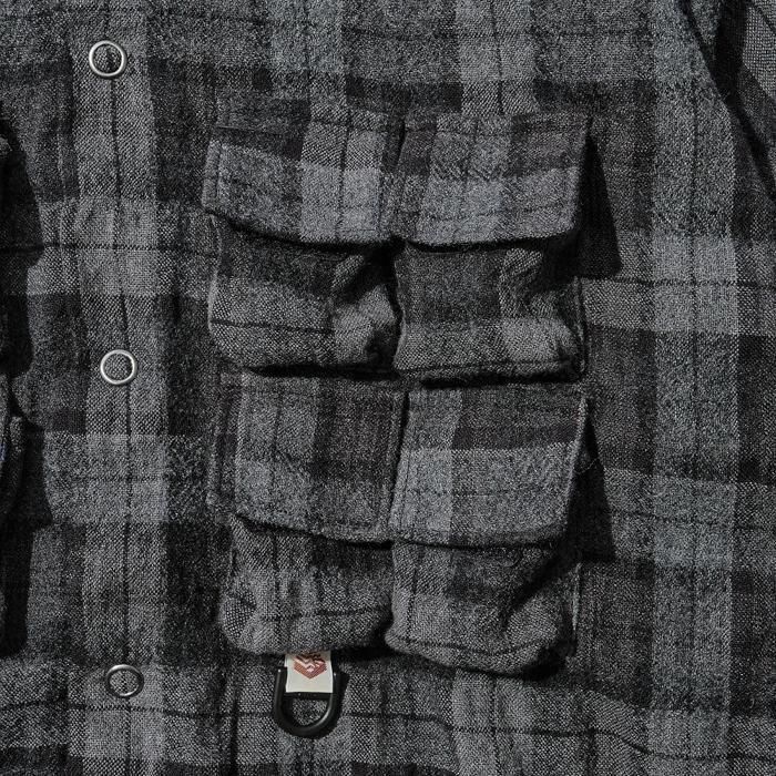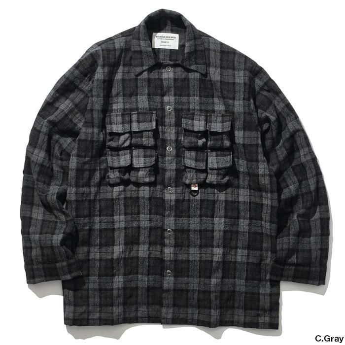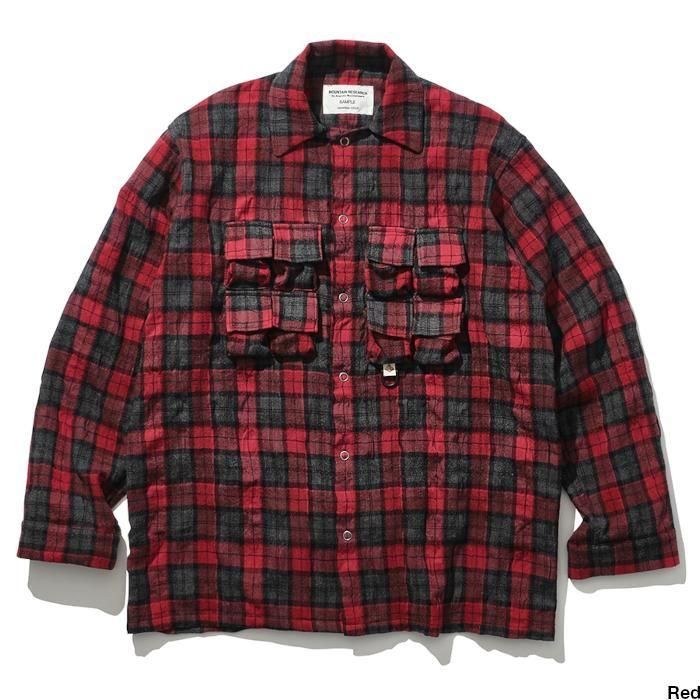 マウンテンリサーチ初期より、ブランド意匠を自負するフィッシングベスト由来のポケットを用いたパジャマシャツ。